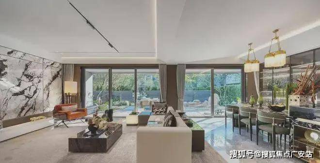 约628㎡的无界会所,作为溪前雅居的关键归家场景之一,更是壕出天际。如镜面的池底铺满了Prada绿奢石,光与影的跃动下更显高级。