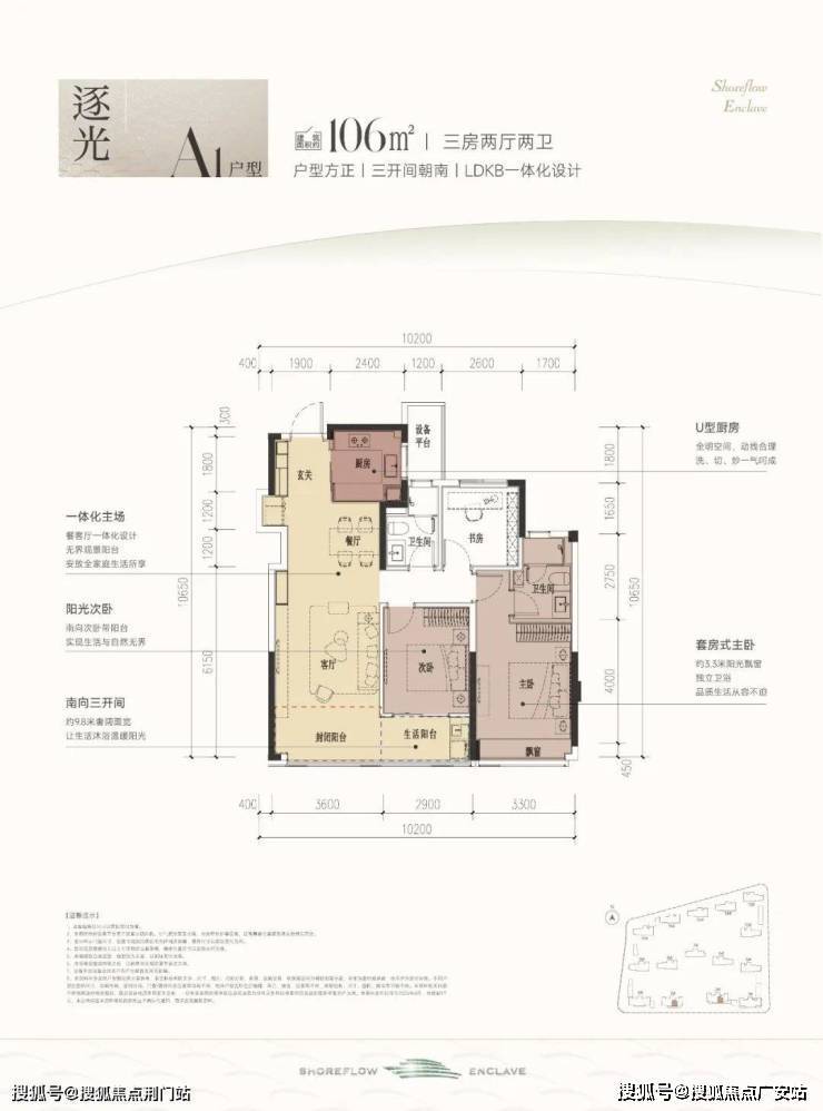建筑面积约106㎡A1户型,户型方正,三开间朝南+LDKB一体化设计,基本没什么浪费面积。虽然是中间套设计,但做到了全明户型,通风效果好,可以说杭州少见。