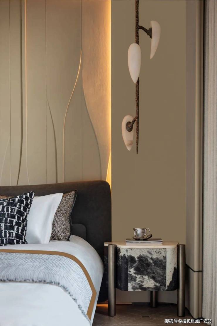 主卧床头曲线纹理自由生长,倒挂的艺术灯像一颗颗种子悬于素色软包之上,艺术品杯盏倏然点破静谧。温馨舒适的私密空间中,享受着难得的闲暇时光,当艺术退为背景,身体方是空间主角。