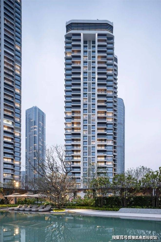 在建筑设计上,项目采取了极具辨识度的“游艇式”建筑语言,可以令人“穿越到未来”的先锋设计。立面从湾区塔尖生活范本深圳招商玺汲取灵感,通过游艇曲线美学、仿游艇甲板设计,一线亲水布局,创造出全景舱观湖视野,以革新性设计理念重构流体建筑美学,打破了传统住宅建筑的平铺直叙,营造出海浪般流动的质感和韵律,通过立体解构手法实现建筑形体的悬浮感与艺术张力,构建出如游艇般舒展而流动的天际线,与远香湖的水岸线形成视觉共鸣。