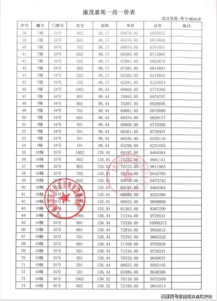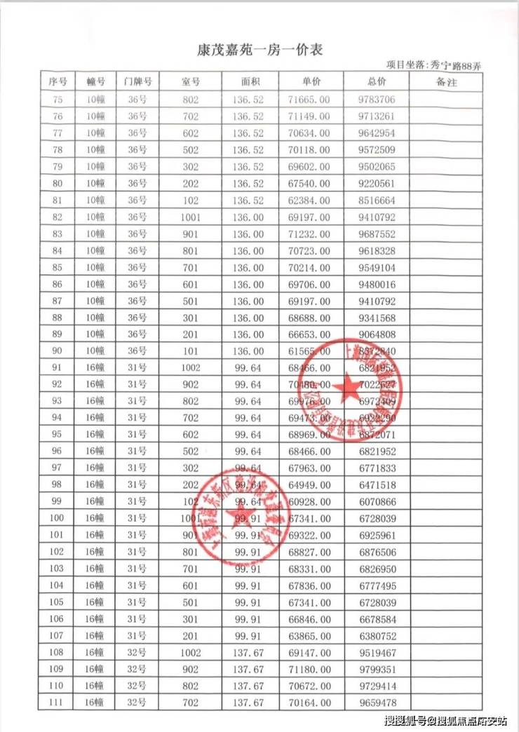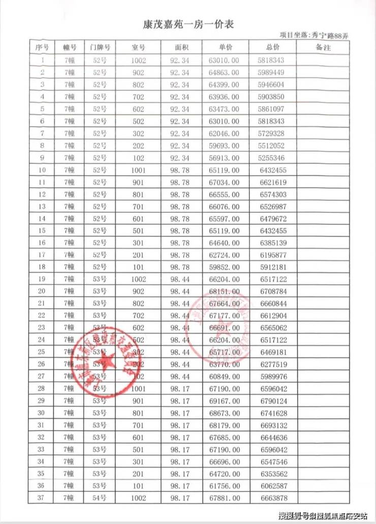 一房一价表如下: