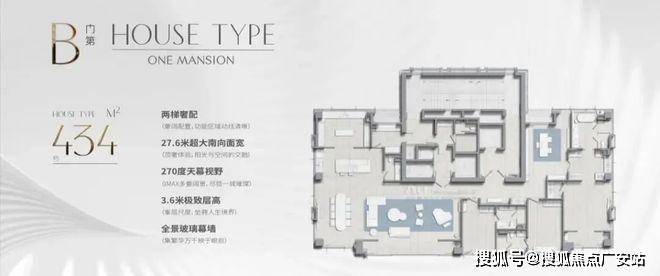 主力户型:434㎡四房三厅五卫(两梯一户)、579㎡五房四厅六卫(三梯一户)。