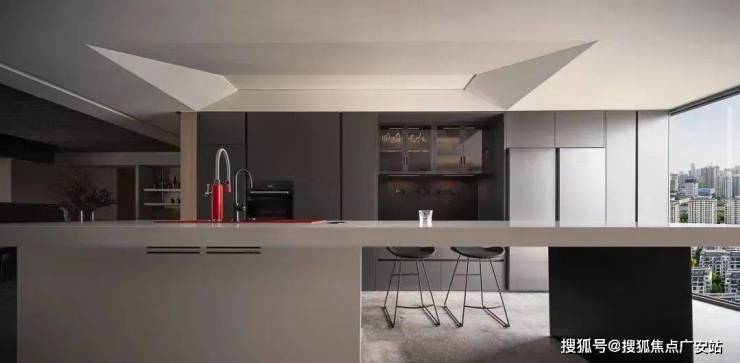 客餐厅采用一体化结构,扩大生活空间,也增进了一家人的亲密性。开放式厨房与餐厅之间由吧台隔断,高低差为一体化区域作下界限。