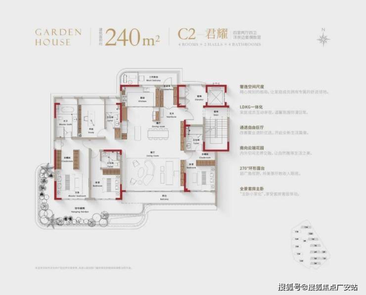 再来看看户型设计,完美呼应了四代宅的超高使用率,空中露台、阳台等各项数据的尺度非常惊人