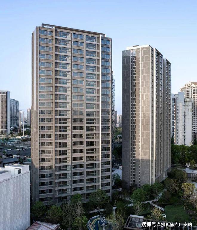 立面材料选取稍显沉稳的“皇室啡”花岗岩,其特殊的颜色与纹理,既能与北侧的办公统一色调风格,也能和周边现有的高容积率建筑,以及绿树成荫的街道环境融为一体,呈现低调精致、简洁大方的高品质住宅形象。