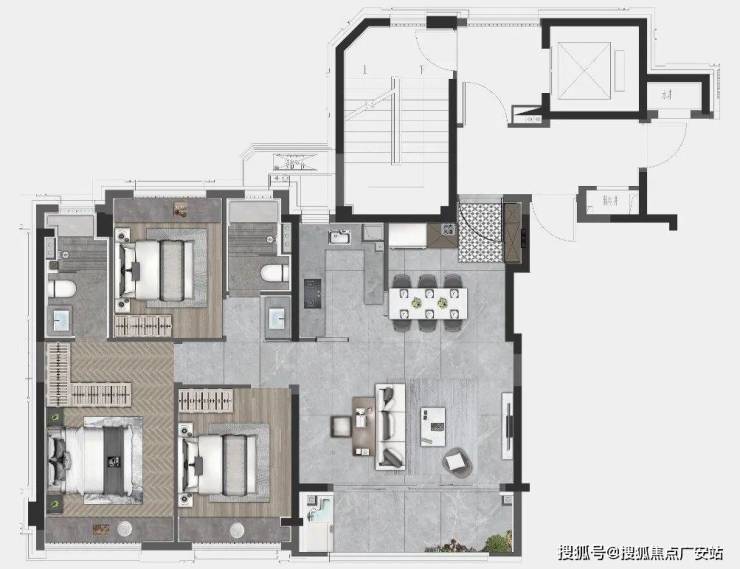项目建面约103㎡3房同样是三开间+大横厅的布局,但在主卧尺度上更进一步,可以隔出一个大衣帽间和化妆间,让女主人释放买买买的天性!