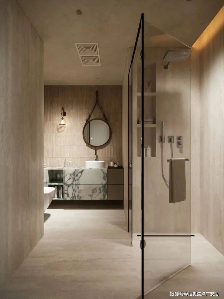 卫生间现代风格的干湿分离的设计,材质上,洞石砖与拇指砖搭配铺贴,自然的美感中又有个性。