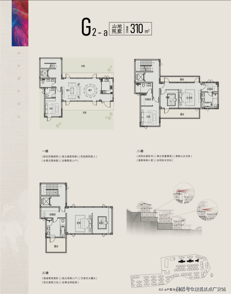 地上三层(一层3.4米、二层3米、三层2.9米+坡屋顶),地下一层(层高3.1米-6.6米)