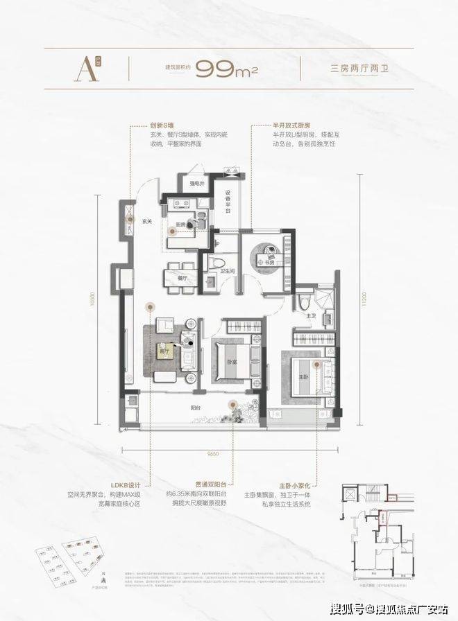 建面约129平方米四房两卫和99平方米三房两卫的户型,也都各有亮点。前者具有宽屏大横厅和约9.1米跑道阳台,后者也具有约6.35米的起步双联阳台,视野开阔。