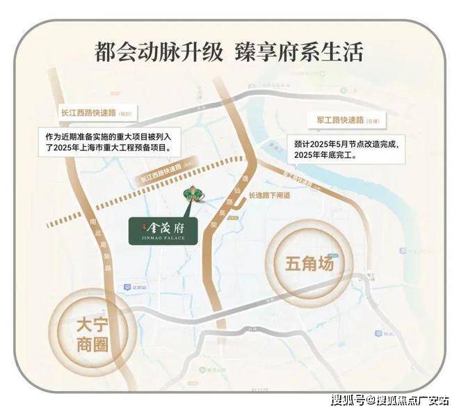 在城市交通路网方面,江湾金茂府同样优势显著。周边拥享中环高架、长江西路快速路、外环高速三横主轴,以及逸仙路高架、南北高架两纵接驳。