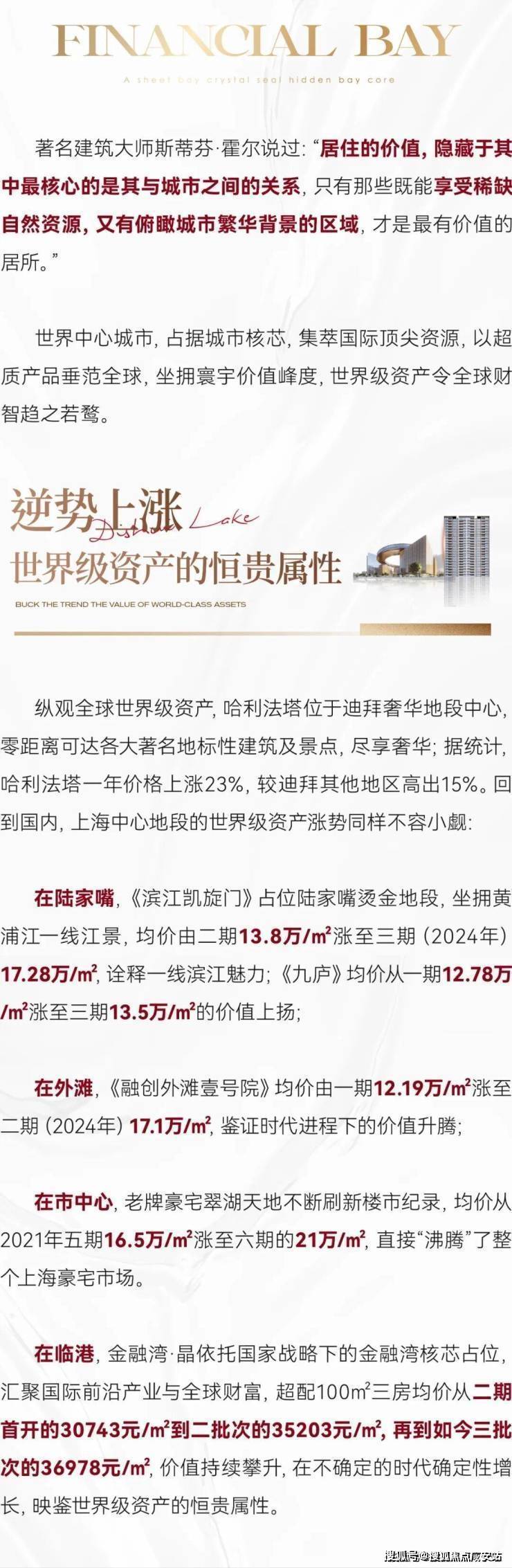 【核心价值】临港金融湾·晶作为新片区“封面之作”,地处滴水湖金融湾核心,坐拥“一环二园三水四景”景观体系与270°L型观湖阳台,重新定义高端湖居生活1。项目直面滴水湖一线景观,北岛樱花、西岛双子塔尽收眼底,铝板+玻璃幕墙打造“天幕立面”,品质对标十万单价豪宅23。
