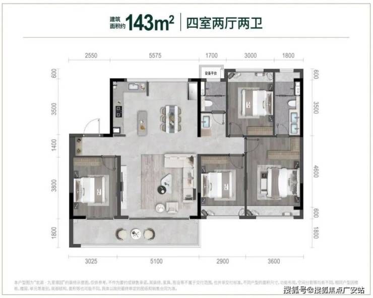 143㎡的户型非常优秀,双联阳台,开间超过8米,3卧朝南,餐厨一体化空间利用率非常高。