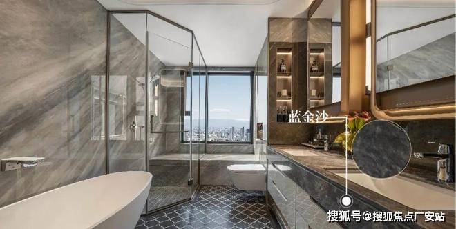 在卫浴间里,蓝金沙奢石铺就的台面充斥着浪漫与优雅的美感,繁星熠熠,漫若浮光,其独特的流沙质感纹理将卫浴的私密质感衬托得恰到好处,深受高端酒店的喜爱。