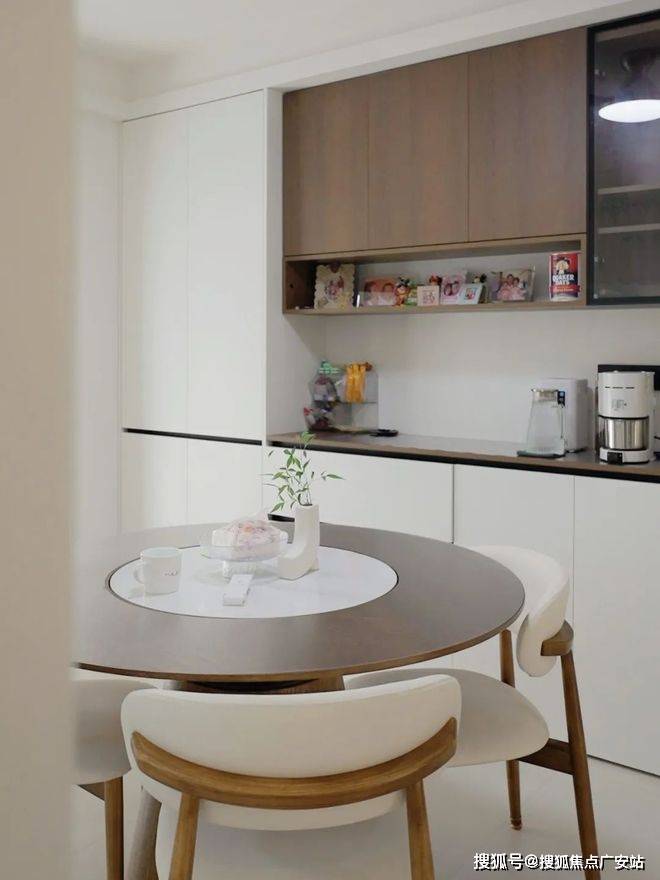 当夏季风扇低转速时,风扇灯将热浪切成薄片,光影在墙面投下动态复古电影胶片效果;靠墙定制整面收纳柜,其中开放格占比30%,用来展示业主淘来的好物件;而相比长方形餐桌的主客之分,圆桌消除等级感,还原家庭聚餐的平等氛围。