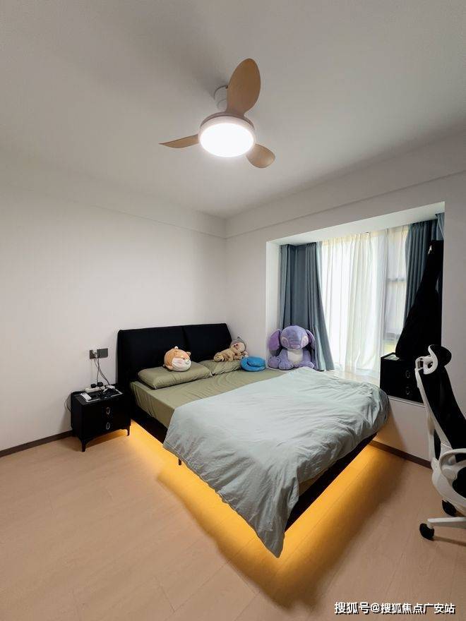 卧室通过黑、木、白三色构建出既沉稳又温润的休憩空间。黑色软包床(视觉重量100%)+原木地板(重量60%)+白墙(重量20%)营造悬浮感,此搭配使12㎡卧室获得15㎡的空间感知。