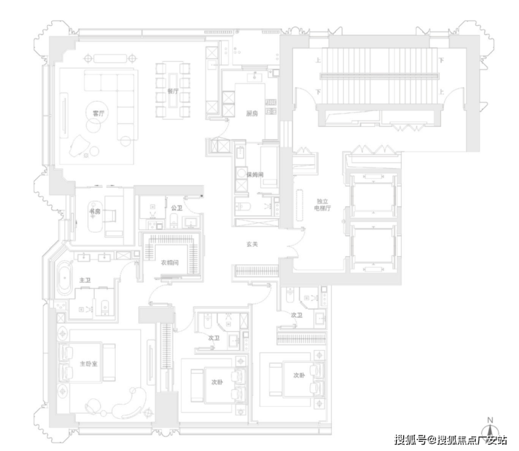 行政级主卧套房:双开门仪式感,超尺度空间,配置独立衣帽间、双台盆卫浴(浴缸+淋浴)、类酒店Mini Bar及私享客厅,休憩、社交、观景功能完备。