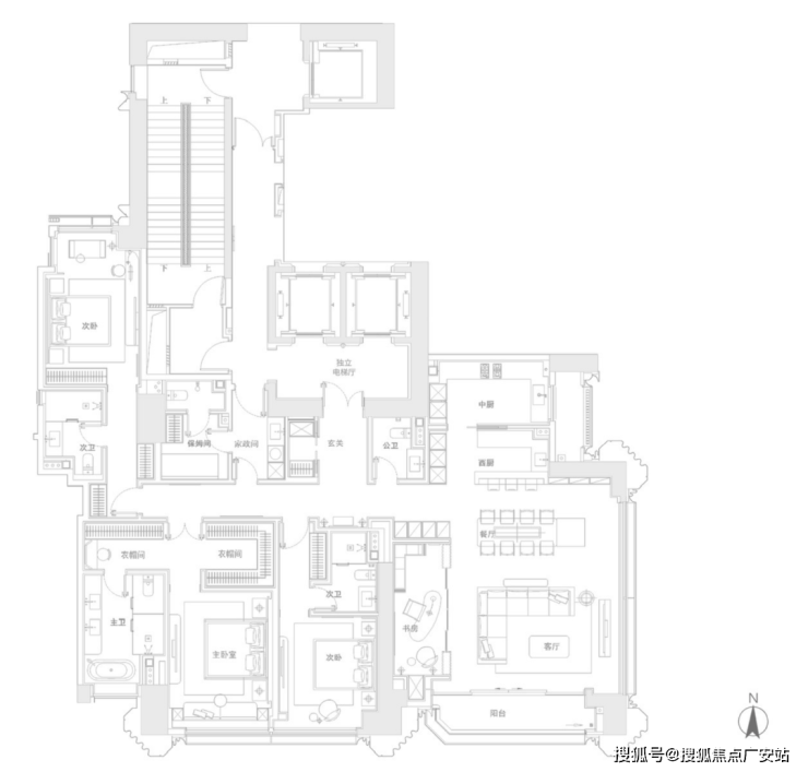 独立家政动线:保姆间/家政间独立入户,配备专属卫浴及洗衣区,与主人生活空间完美区隔。