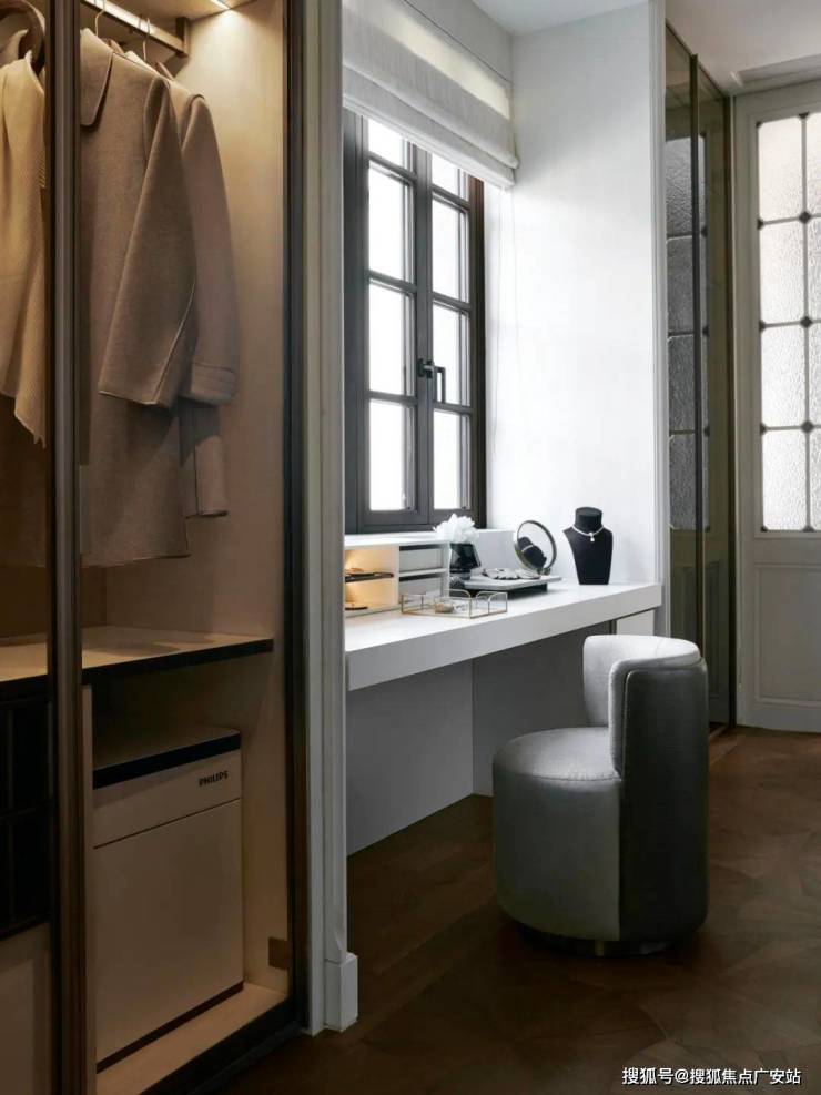 地面用鱼肚灰加实际黑金的石材拼花并且采用水刀工艺方式在地面做了拼花处理,黑框门窗、中古风边柜,无不彰显海派情怀中精炼于时间的优雅;家庭空间连接着主卧与儿童房间,每一步的尺度和光影都让人心思沉静,大到空间的划分,细至家具的尺度,它们相互连接、彼此作用,一步一景,引人入胜。