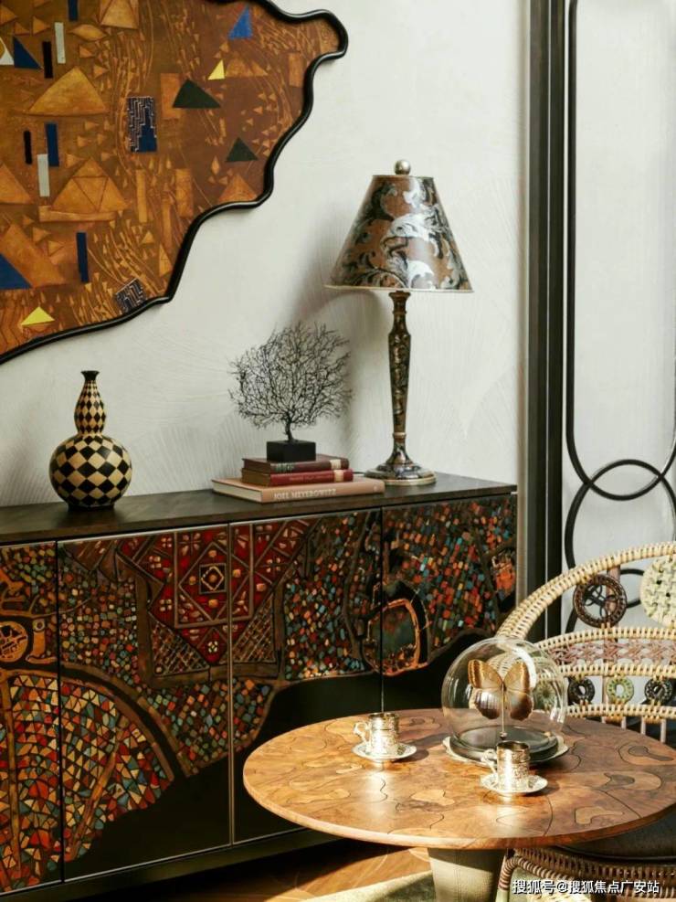 玄关柜选用的是曾经上过佳士得拍卖行的同系列柜体、柜体的材质运用泰国进口稀有珍珠鱼皮密拼,将稀有材料与传统技艺相结合,每条鱼只有鱼背中心一块可以使用,处理后的鱼皮手感特别。
