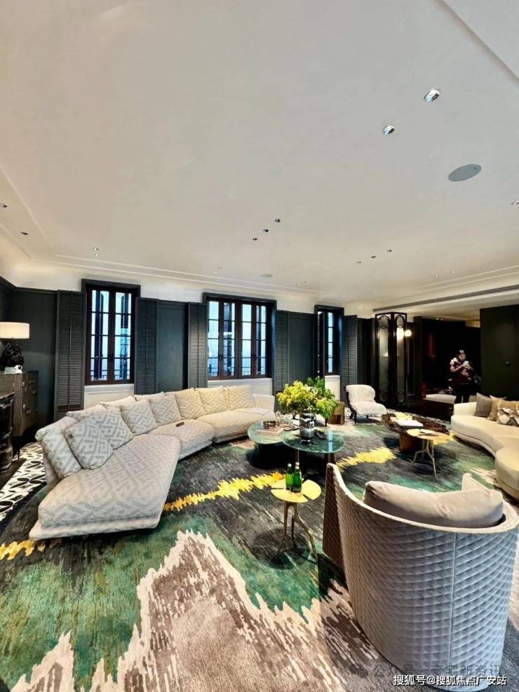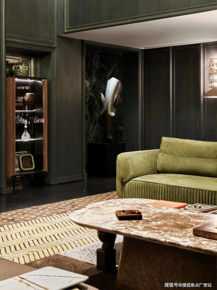 客厅整体面宽达9米,亮色装饰线条的深绿色墙面还原海派建筑风华,也彰显传承之意;La Greca模块化主沙发由意大利顶级奢侈家居品牌VERSACE出品,自由子和的茶几组合一款由艺术家雕刻出花叶后固化封脂而成,另一款则采用意大利翡翠玉打造,散发着低调奢华的艺术格调。