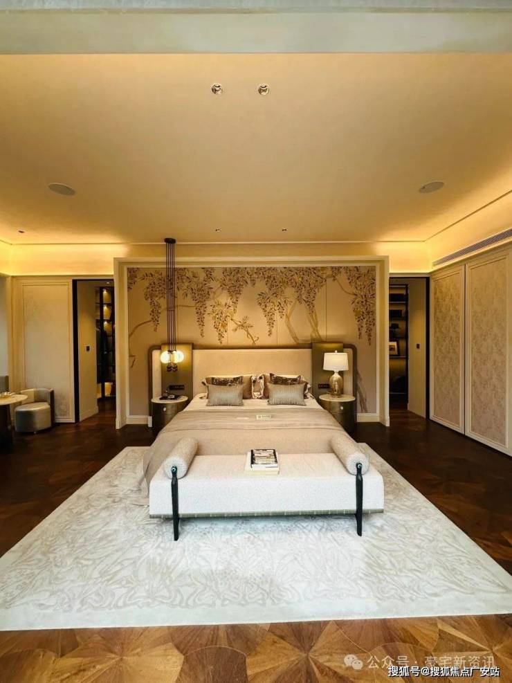 复古拼花地板、古董边柜、印度手绣壁纸,每一寸线条道尽委婉细腻的东方表达。错落有致的金色紫藤透过金丝和贴花的精湛工艺,在羊毛缎面织物上垂落缠绕,自然、温暖、高雅充盈休憩空间。