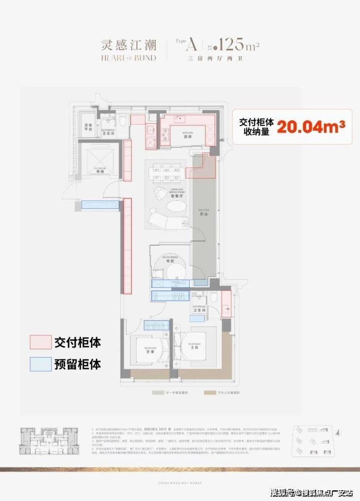 据小胖君手工统计,项目125㎡3房边套户型的整体交付柜子+预留衣柜,收纳空间可以达到约20.04m³,中间套户型也能达到约16.56m³!