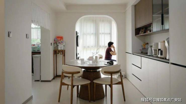 当夏季风扇低转速时,风扇灯将热浪切成薄片,光影在墙面投下动态复古电影胶片效果;靠墙定制整面收纳柜,其中开放格占比30%,用来展示业主淘来的好物件;而相比长方形餐桌的主客之分,圆桌消除等级感,还原家庭聚餐的平等氛围。