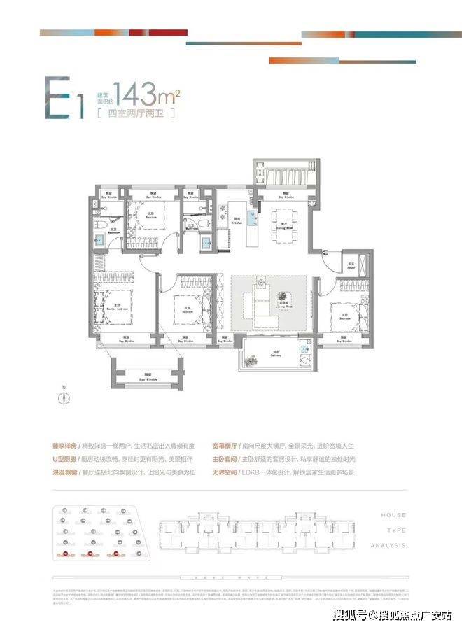 建面约143㎡的四房户型,三房朝南+主卧大套房,属于四房最好户型