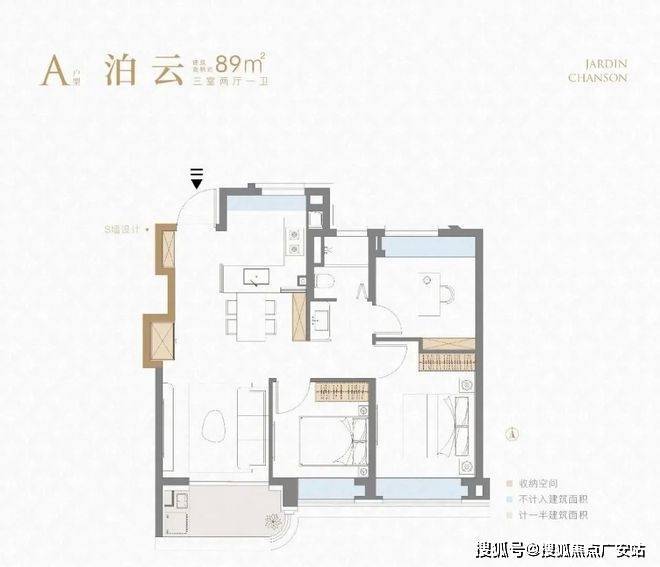 ①建面约89㎡3房2厅1卫户型: