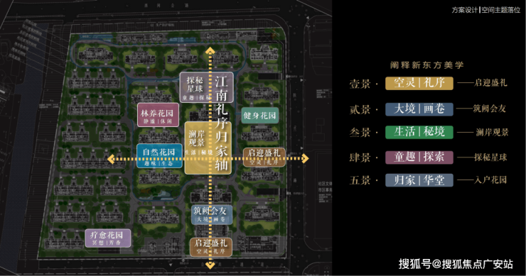 以江南人文精神为源点,打造两轴一环五进空间,江南礼序归家轴串联启迎盛礼、筑阙会友、归家华堂等5重礼制,尊崇归家;健康运动轴以24小时跑道为社区活力生活环,串联儿童乐园、长者康养、疗愈花园等10大生活场景,营造全龄全时的江南诗意生活