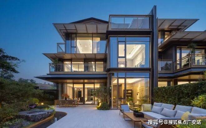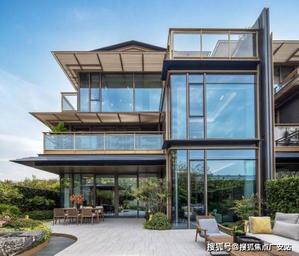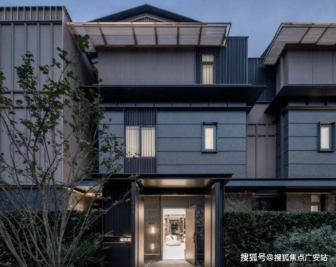 融合现代设计:玻璃体块交叠、悬挑露台、金属格栅引檐,兼具传统符号与当代功能性。