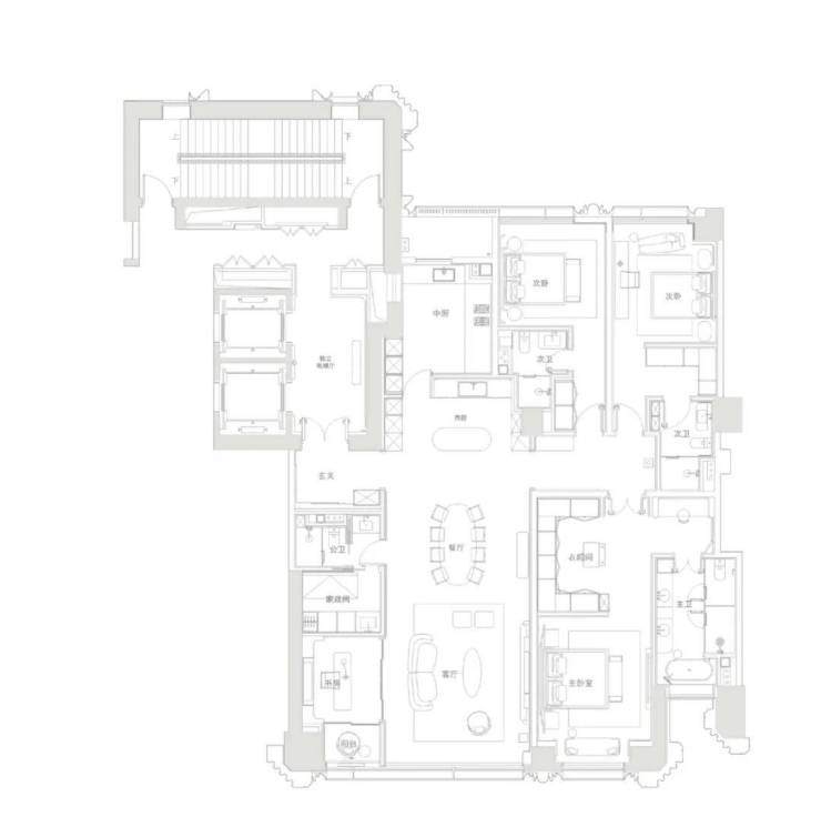 600平户型是6房带4套房,搭配有专属书房,带有男女主人双重衣帽间;