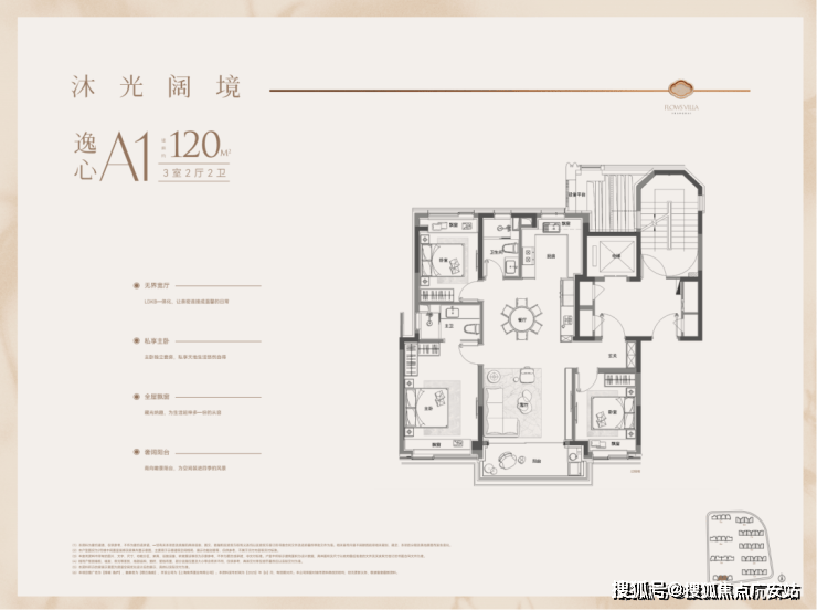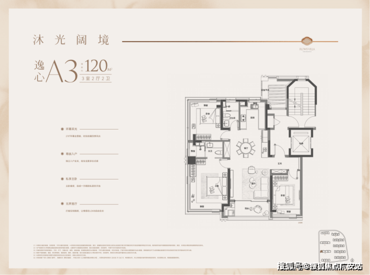 120㎡ 3 房 2 卫:三开间朝南、270° 转角飘窗、类一梯一户(约 7–8㎡独立电梯厅)、全明通透。