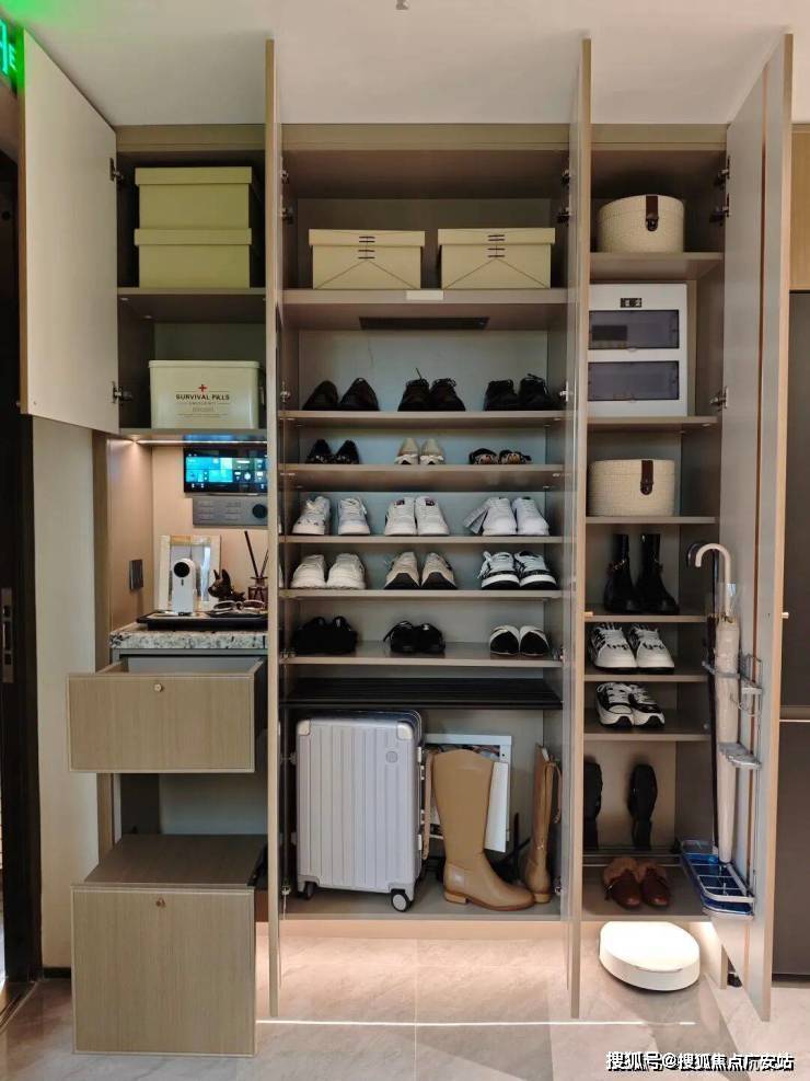 并且,玄关柜和鞋柜的部分做了非常多的功能分区设计,小到隐藏的穿鞋凳、伞架和扫地机器人,大到除臭精灵、长靴、行李箱,都能放进这个空间内。