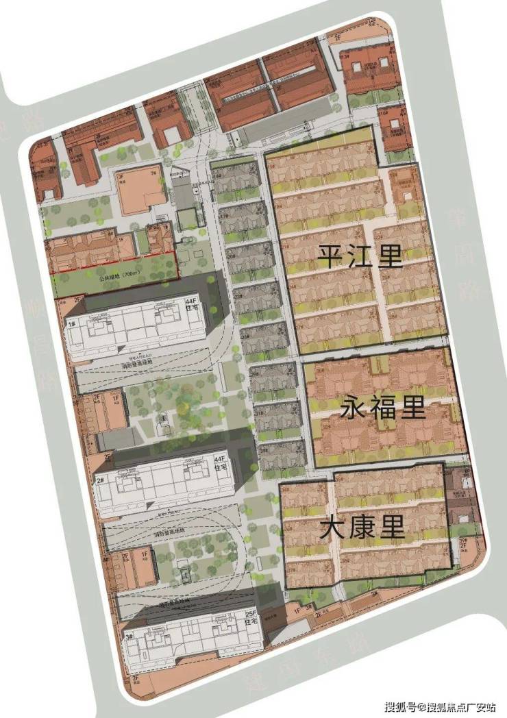中海·顺昌玖里秉持“传承革新”的地脉文化精神,在片区的城市更新中,遵循土地的演进脉络和肌理,保留了地块当中原有的平江里、大康里、永福里三大组团格局,参照留存下来的地图文志资料,梳理还原出地块内部3大组团、2条竖向主弄、9条横向支弄的城市肌理格局。