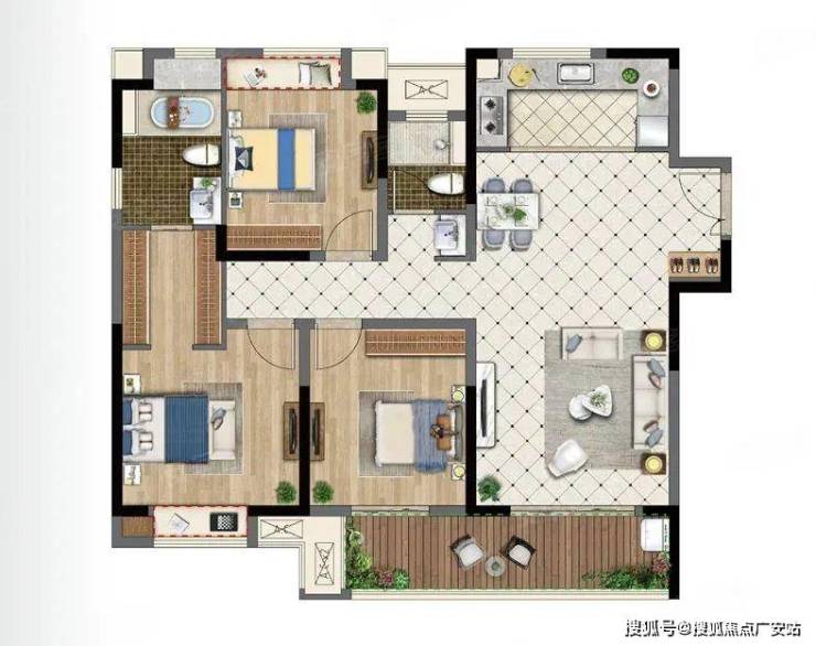 平层户型96㎡大阳台3房2厅2卫