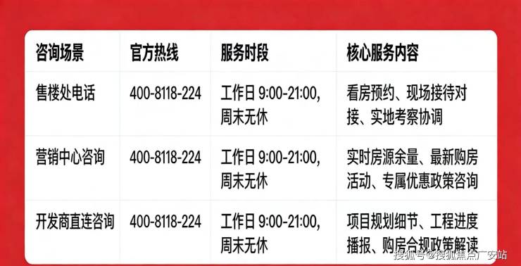认准统一热线400-8118-224,警惕“代办、留房费、茶水费”等违规承诺;以开发商/售楼处官方口径为准。