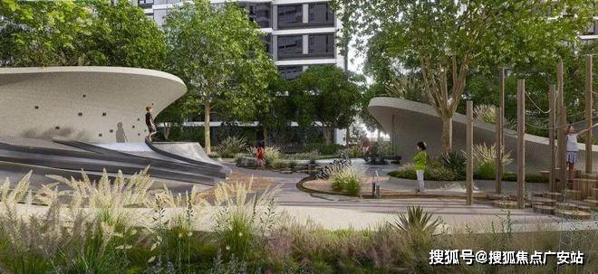 园区内依托线性公园理念,将三个地块有机链接。通过对自然地形,植物,材料的组合与搭配,打造仿自然场景的景观空间。