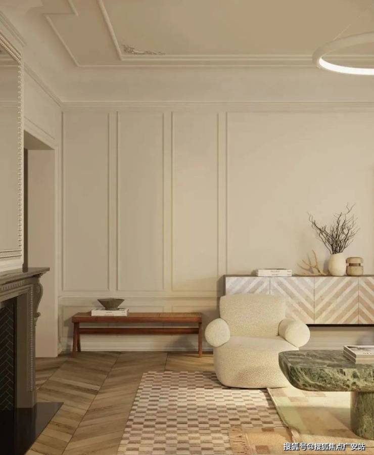 空间中每个物件都经过精心挑选:鱼骨拼木地板沉淀时光质感,格纹地毯与抹茶色大理石茶几搭配,营造出优雅而不失温度的氛围。