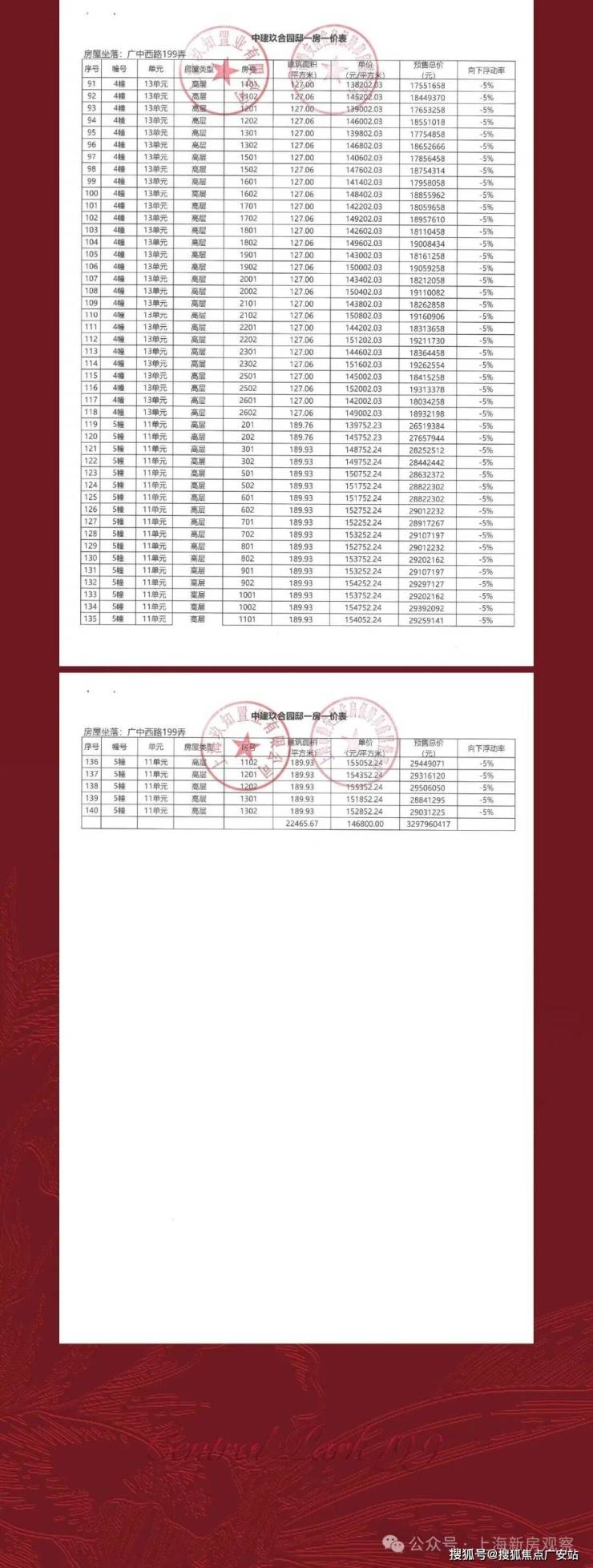 上期一房一价表如下