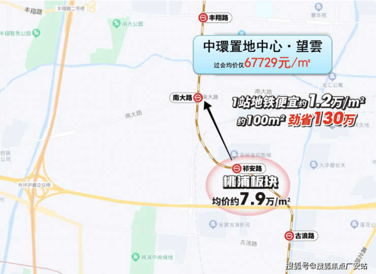 中環置地中心·望雲过会均价仅67729元/㎡,项目所在南大路站的前1站是祁安路站。祁安路站的新房项目联动价已达7.9万/㎡,1站路的差价高达约1万/㎡,百平米就能立省100万+,这样的性价比实在是太诱人了。