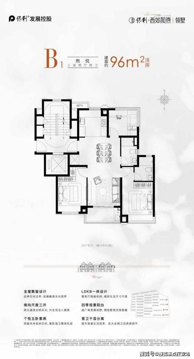 建面约96㎡的 洋房户型,以三房两卫的全能格局。