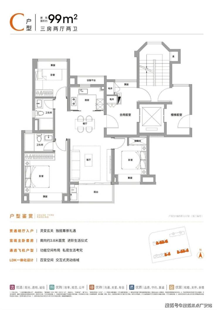 建面约99㎡3房2卫: