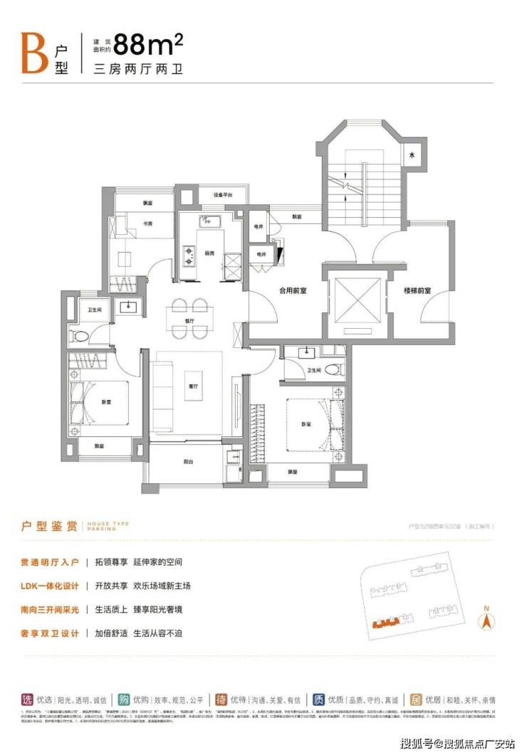 建面约88㎡3房2卫: