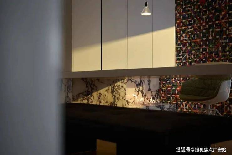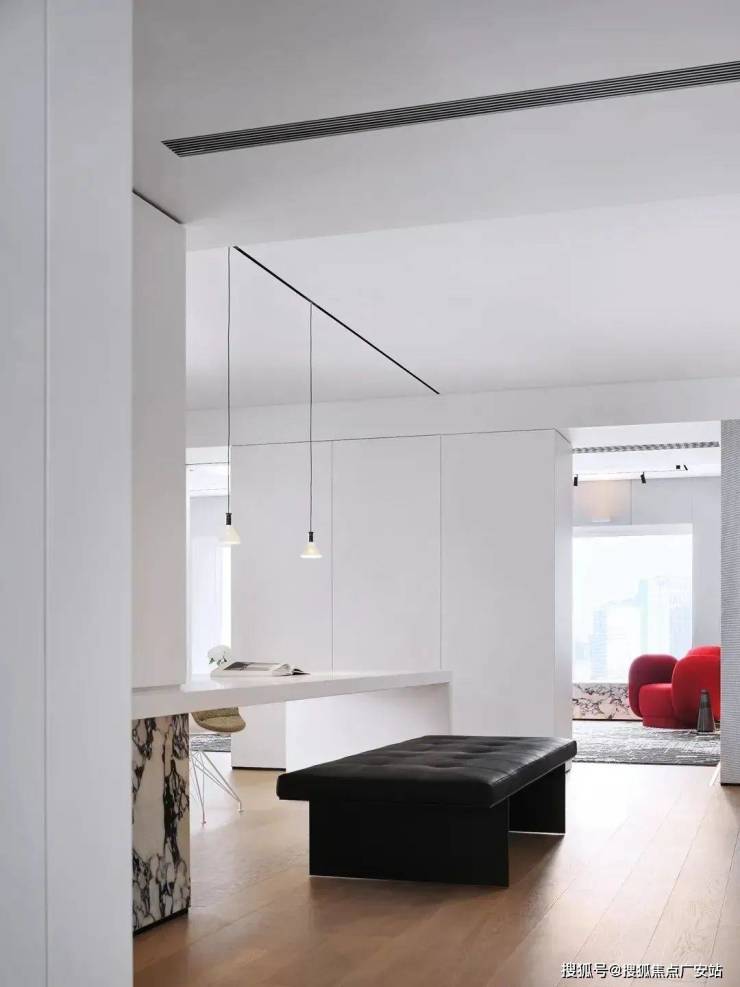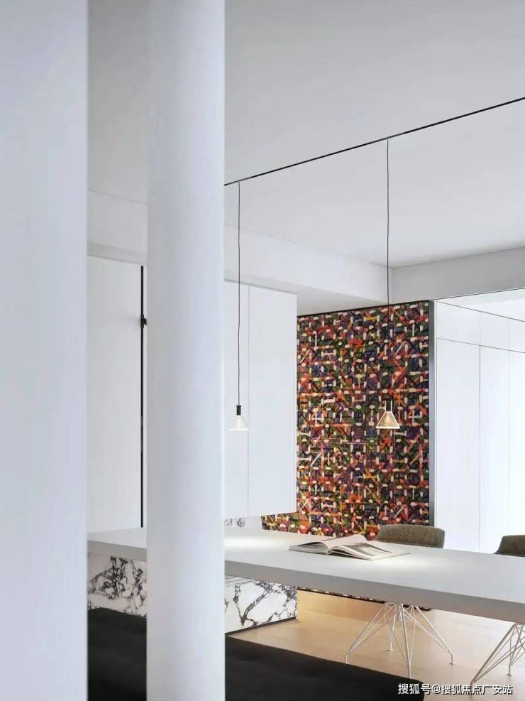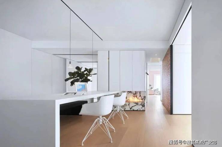 穿过玄关,极简的白,岛台、台面、吊柜均处理为细腻的白色面板贯穿,极致的纯粹其实很美。中岛的空间,既是用餐区,也是家人平时学习工作的区域。