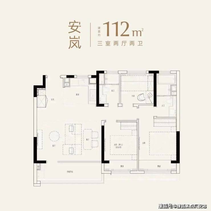 户型点评:这是项目的最小户型;3房2厅2卫的房屋套型,3开间朝南;客厅+餐厅的大宽厅设计;主卧是套房设计,有独立的卫生间;该户型仅有2个飘窗,赠送空间相对较少