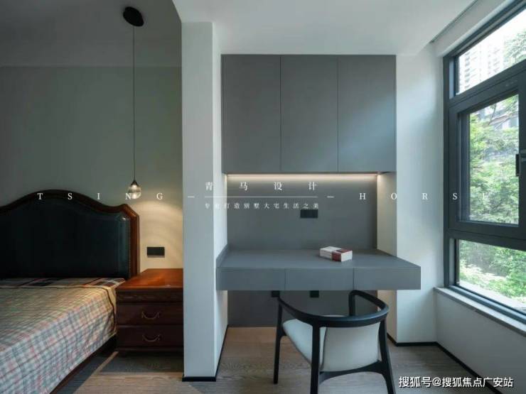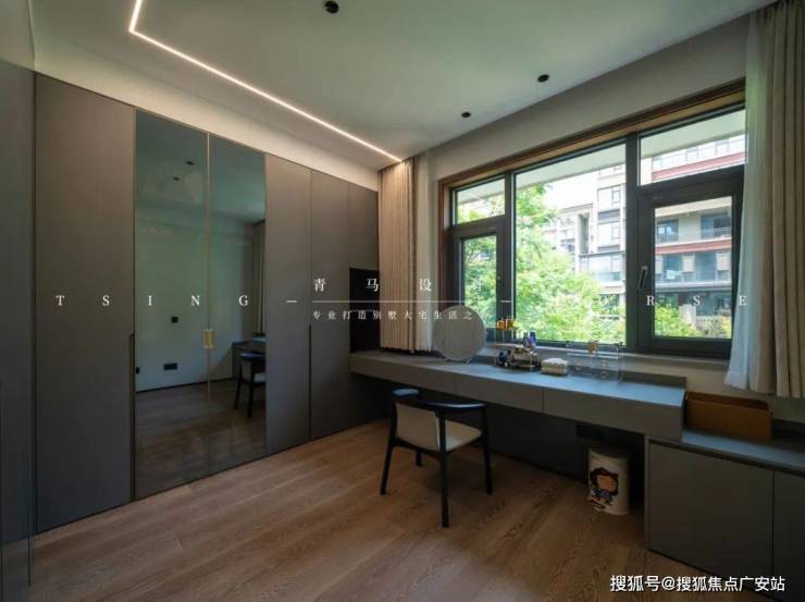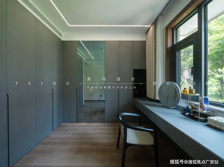 衣帽间容纳一家人的衣物,温润的木质与玻璃交织,营造低调自然的艺术美。捧一本书,倚坐在窗前静静阅读,享受偷得浮生半日闲的悠然自得。晨光微熹,在阳光温柔的唤醒下,拥抱每一天。