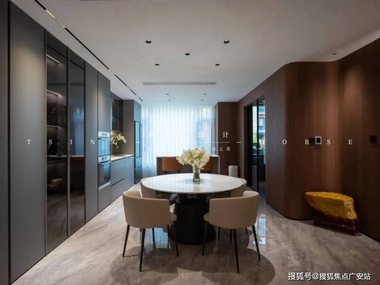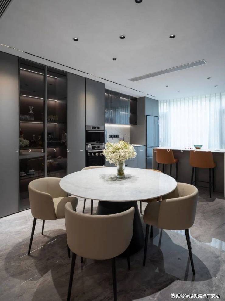 米灰色餐边柜简洁优雅,搭配磁吸轨道灯烘托温馨氛围,岛台的加入亦为生活带来一丝多样化,尽情享受与家人一起用餐的美好时光。