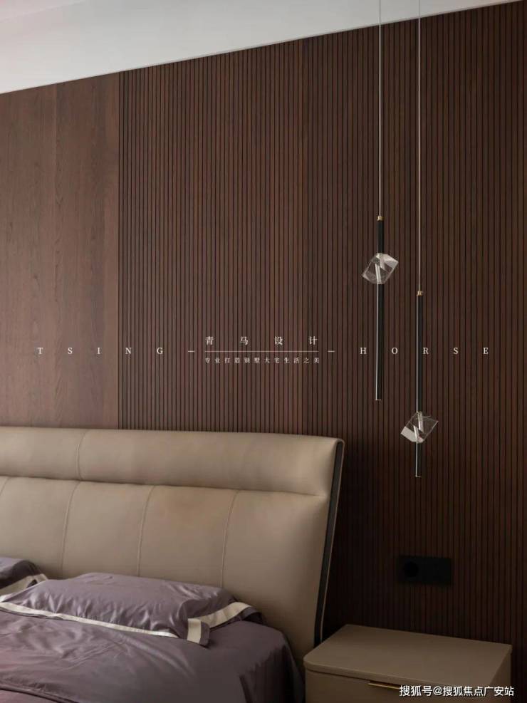 主卧大面积的木质背景墙优雅大方,褪去繁杂的造型,用简单的线条描摹出纯粹的环境氛围,在安静的空间中抒写肌理与质感,塑造精神领域的内涵。