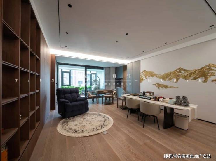 通过追求材料与光线的互动,打造这方自由惬意的休闲娱乐空间,午后阳光穿过朦胧透光的百叶帘,洒在原木家具上,为空间注入了一份舒适和柔软。